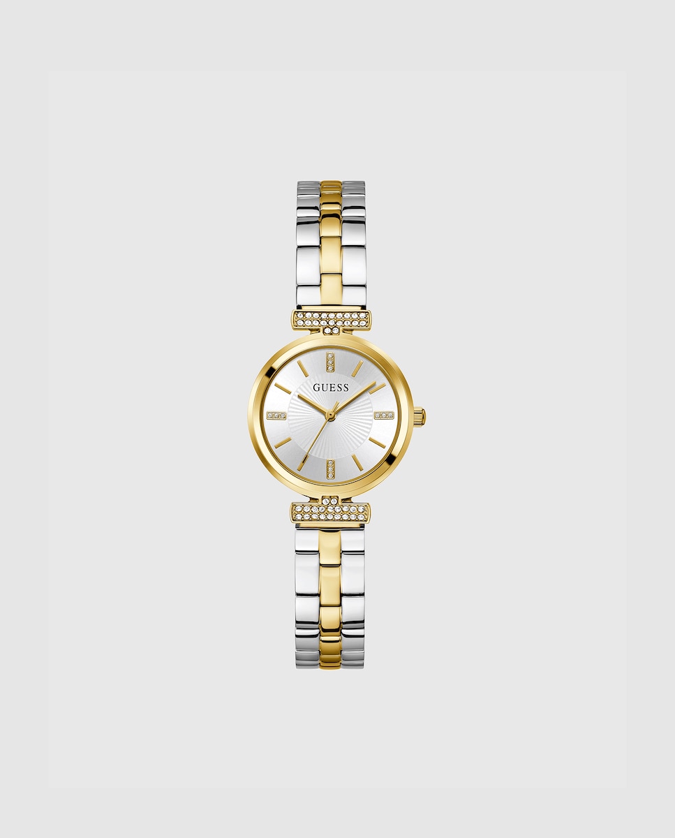Relógio de mulher Array GW0762L5 de aço e bracelete prateado. Relógio de aço para mulher da marca Guess. Pulseira de aço bicolor em prateado e dourado com pedraria na parte superior a condizer com a caixa e o mostrador prateados. Suculência e elegância para a coleção ARRAY com reminiscências aos relógios clássicos.