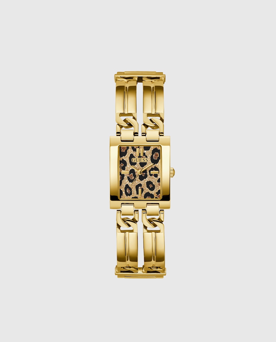 Relógio de mulher Mod id GW0807L2 de aço e bracelete dourado. Relógio de aço para mulher da marca Guess. Relógio de aço prateado com mostrador com estampado animal. Os clássicos nunca morrem e Guess recria nesta nova coleção MOD IN a sua eterna, mítica e característica coleção Heavy Metal, um top vendas. Com um original design de bracelete adaptável, o semi bangle com pedraria se entrelaça com as correntes. Original e único, perfeito para as amantes da marca americana.
