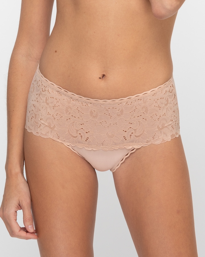Cueca clássica de mulher elegante e feminina, com um design que combina renda delicada na parte frontal e microfibra suave na parte posterior, bordas onduladas e um pequeno nó acetinado que aportam um toque moderno e refinado. Seu corte cobridor nos quadris assegura conforto durante todo o dia, perfeita para qualquer ocasião, e pode ser combinada com o soutien a condizer para um conjunto harmonioso e sofisticado.
