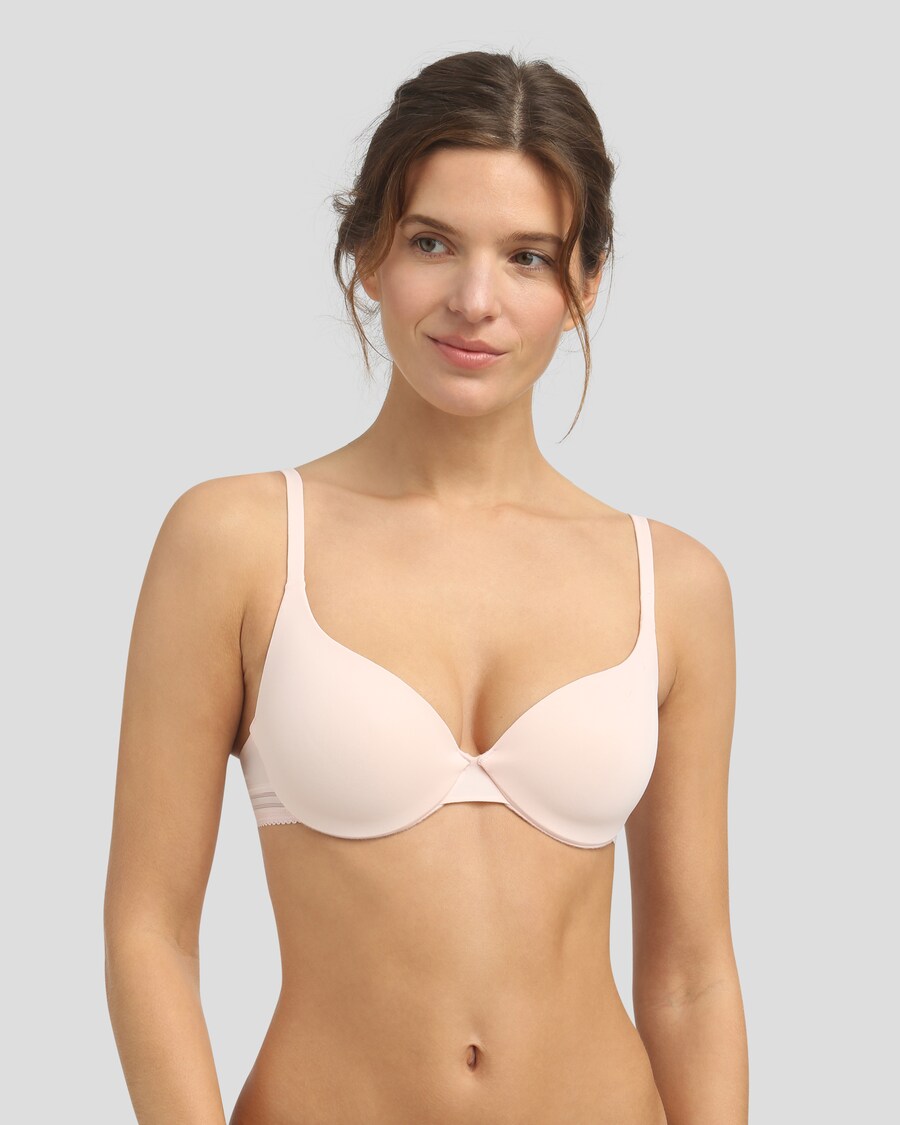 Soutien de microfibra suave tanto nas copas como no interior das copas. Ajusta-se perfeitamente ao corpo e é invisível sob a roupa. Efeito alça contínua que assegura a total invisibilidade. Faixa inferior das costas em elástico para uma maior sustentação. Enchimento leve para dar uma forma mais arredondada ao peito. Fecho com dois colchetes em três posições.