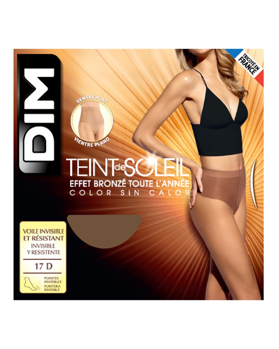 Collants de verão com efeito ventre plano da gama Teint de Soleil da DIM. Os collants Teint de Soleil uniformizam e bronzeiam a pele de uma maneira muito natural. Ninguém se dará conta que os está a usar porque são muito finos e você também não os notará porque não dão calor. Os collants de verão Teint de Soleil da DIM estão tecidos com fio especial bi-consituído com núcleo de poliuretano, que é invisível e extensível, por isso não precisam de elastano e assim conseguimos que não deem calor, têm a biqueira invisível. Este modelo incorpora uma peça de controlo com efeito shaping na zona do ventre e ancas. Collants perfeitos para usar com sandálias. Disponíveis em 3 tons de pele, escolha o que mais se pareça ao seu tom natural de pele: Clair para as peles mais clarinhas, Hâlé e Terracota para as mais morenas.