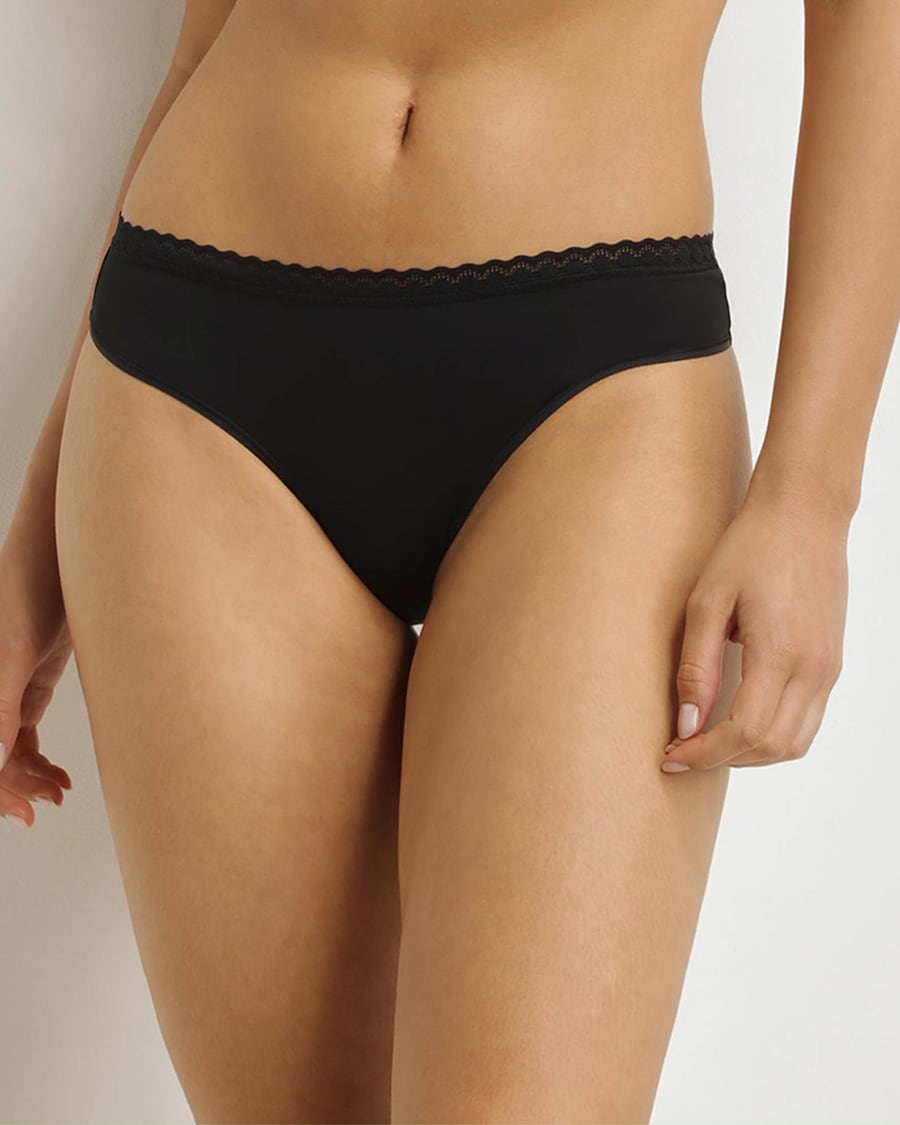 Tanga com detalhe de renda na parte superior. Elásticos planos para assegurar a invisibilidade sob a roupa.