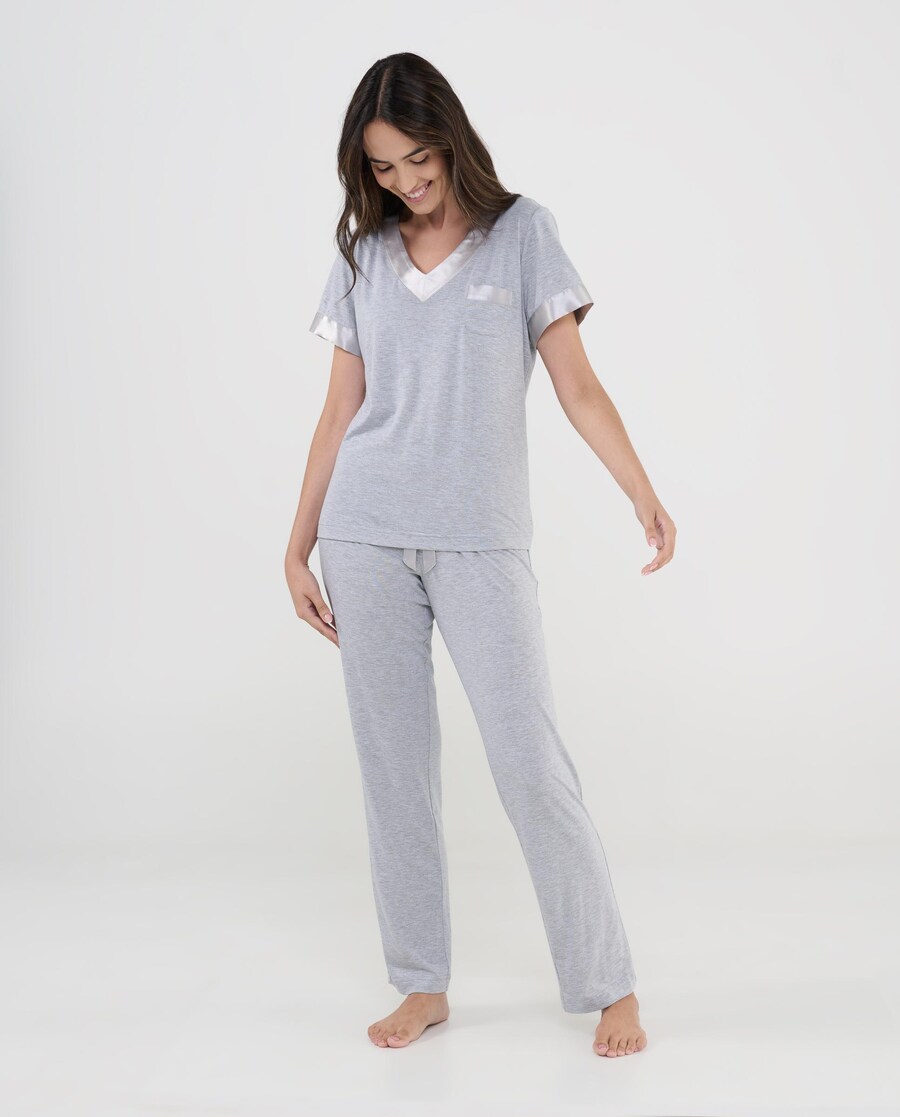 Pijama comprido de mulher em modal suave, com gola em V, mangas com acabamento em cetim ton sur ton.