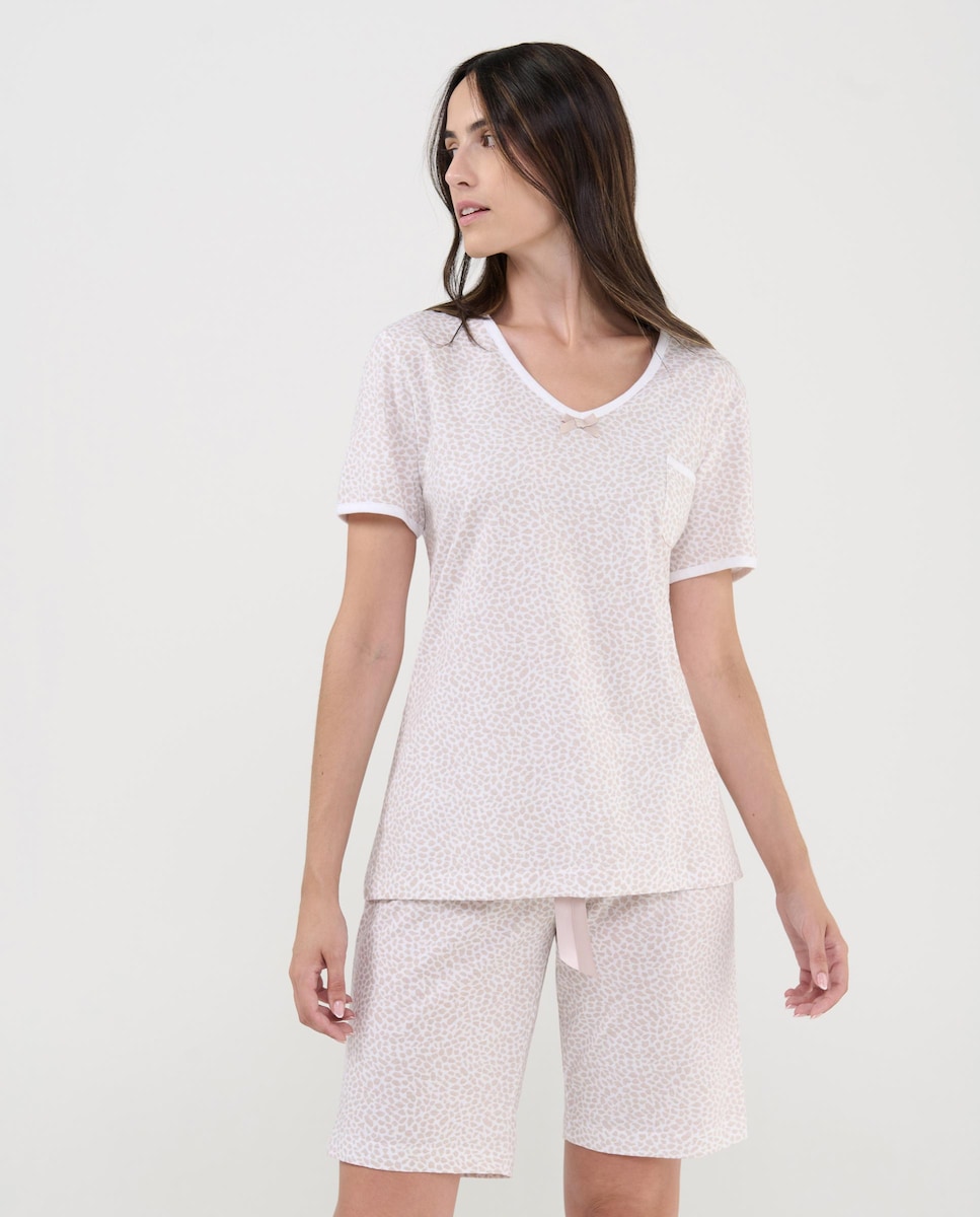 Pijama curto de mulher de manga curta em suave e confortável tecido de malha estampada com bolso decorativo e gola em V em contraste e adorno de lacinho em cetim. Calças curtas ajustáveis com fita de cetim a condizer.