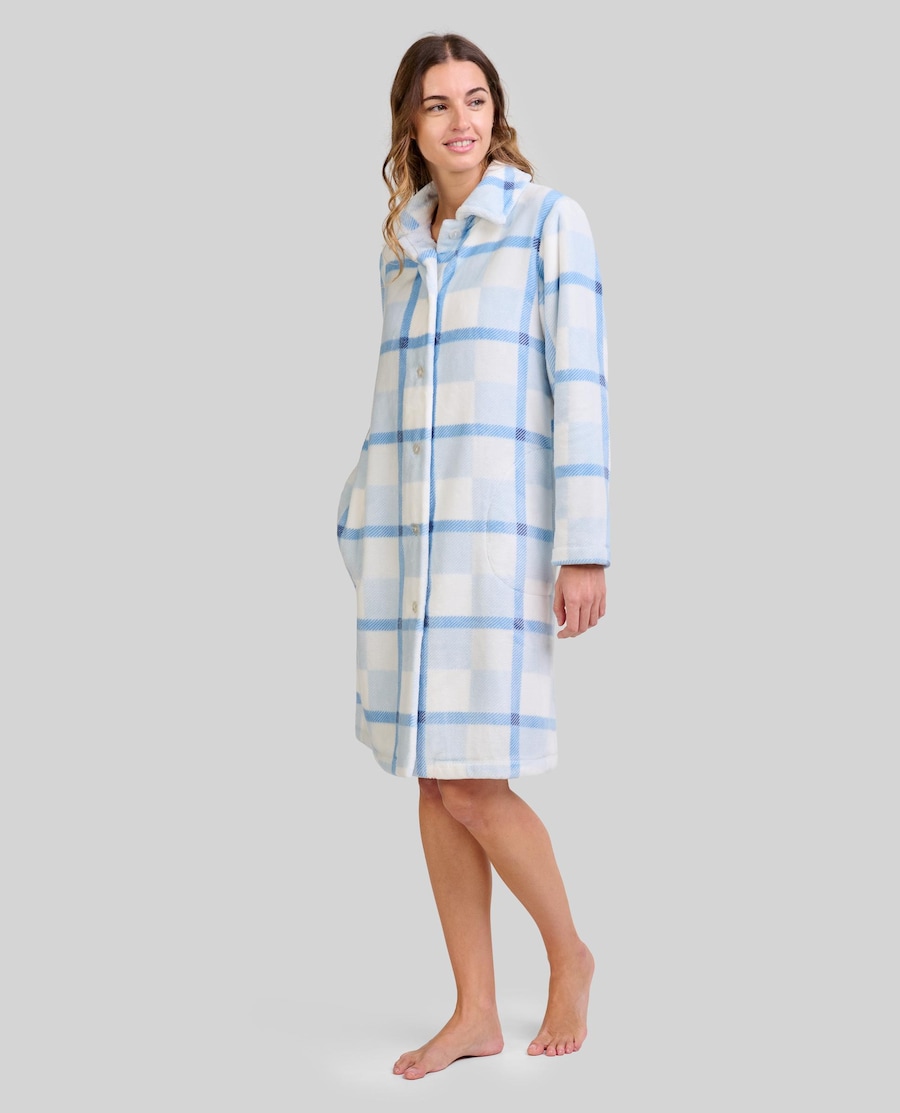 Bata Lohe de mujer cuadros, abertura de botones, bolsillos laterales y manga larga.