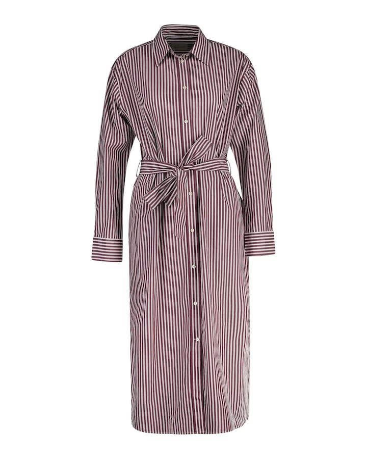 Este vestido tipo camisa está confecionado em uma impecável popeline de algodão às riscas em fio tingido e proporciona uma sensação suave graças ao seu lavado especial. Trata-se de um design de corte folgado com manga comprida e comprimento abaixo do joelho. Apresenta gola francesa, aba completamente com botões, bainha curvada e punhos ajustáveis. É um modelo com botões de poliéster reciclado, cinto de tecido e o logotipo GANT no mesmo tom bordado na aba da manga para mostrar a marca de uma forma discreta. Este vestido foi desenhado com corte folgado, mas, se preferir que fique mais ajustado, recomendamos pedir um tamanho menos.