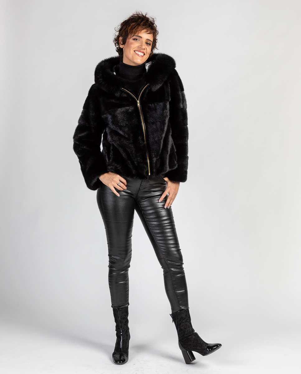 Casaco de mulher De la Roca com pelo de vison em preto, trabalhado em horizontal. A peça dispõe de capuz com acabamento de pelo de raposa ao tom. Fecho de correr e bolsos verticais. Confecionado em Espanha com peles de qualidade Saga.