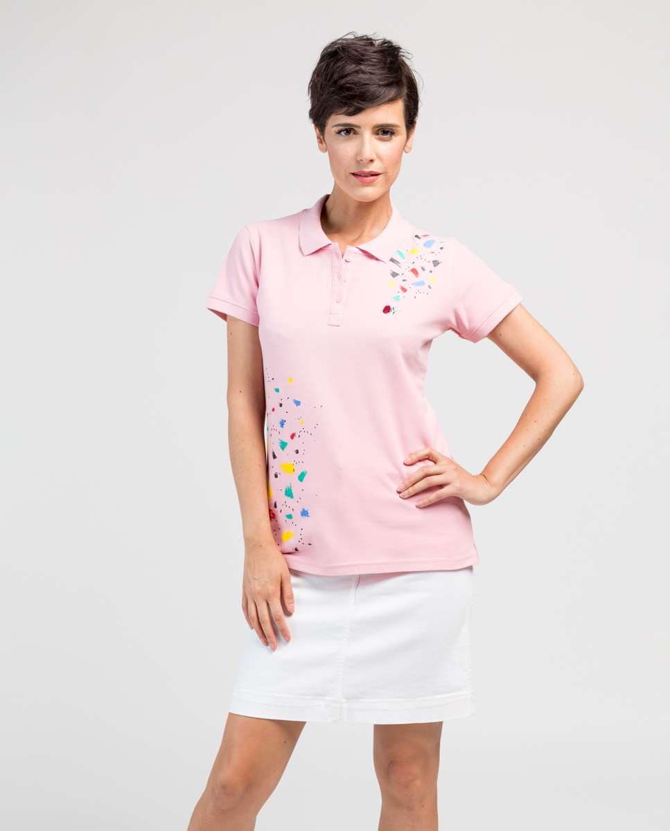 Polo de mulher de manga curta com estampado de cores em tecido de piqué 100 % algodão. Tapeta com três botões. Bocamanga e gola em canelado. Logotipo rosa bordado na parte frontal esquerda. Desenhado por Área Carmen para De la Roca.