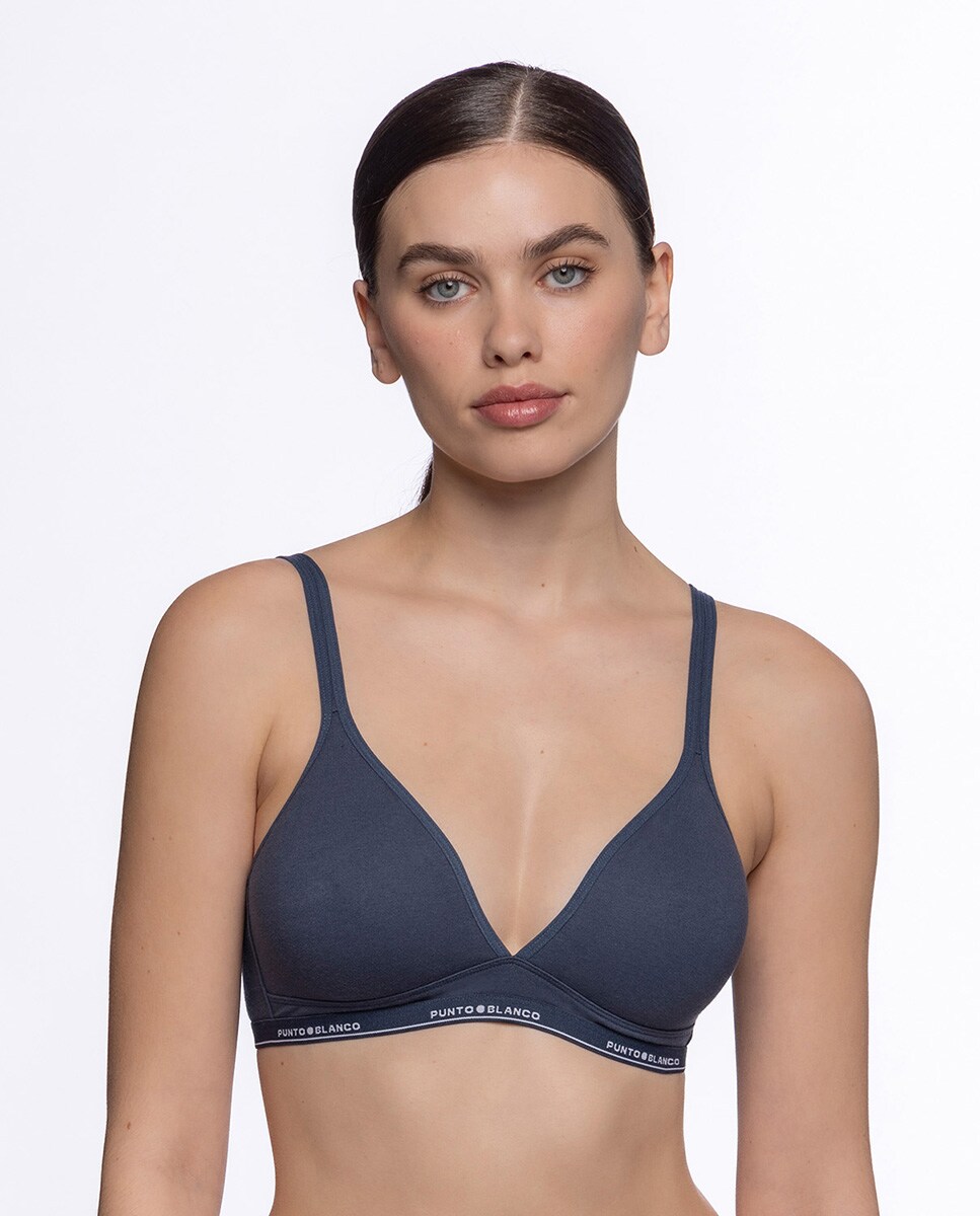Soutien sem aros nem foam de algodão com copa laminada e detalhes em preto e borracha com logotipo. Disponível em branco, preto, cinza mescla e cores de temporada.
