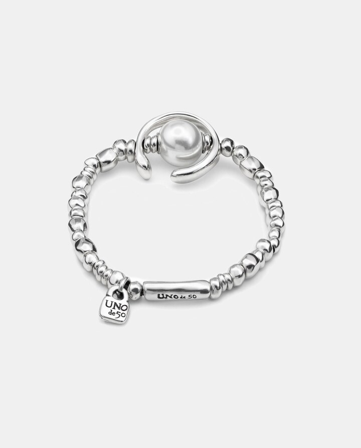 Pulseira de design único elástica realizada com contas de forma arredondada que combina um aro banhado em prata e uma pérola branca. Elaborada de forma artesanal em Espanha.