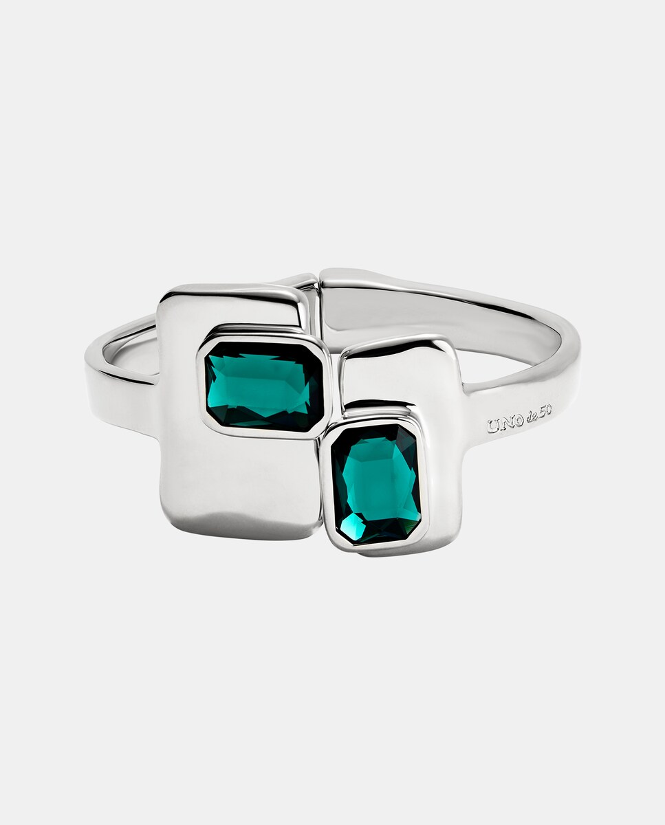 Pulseira rígida banhada em prata de lei com cristais facetados verdes centrais. Elaborada em Espanha, em um processo 100% artesanal.