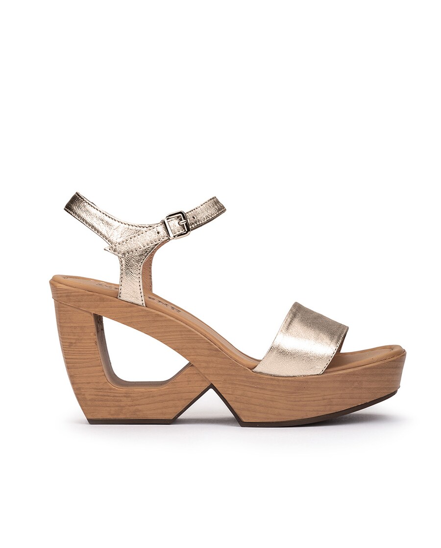 Sandálias de tacão de mulher com fivela e tacão geométrico. Um design atual em que Pedro Miralles reinventa as sandálias clássicas de tacão.