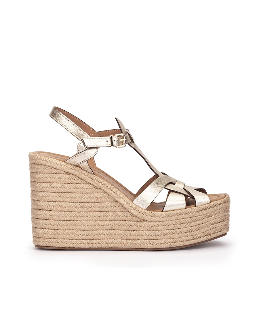 Sandálias de cunha de mulher com plataforma e fecho com fivela. Um modelo desenhado para os dias de verão. A altura da cunha torna-o num modelo apto para eventos e ocasiões especiais. A sua pala de pele recolhe perfeitamente o pé oferecendo um ajuste ótimo.