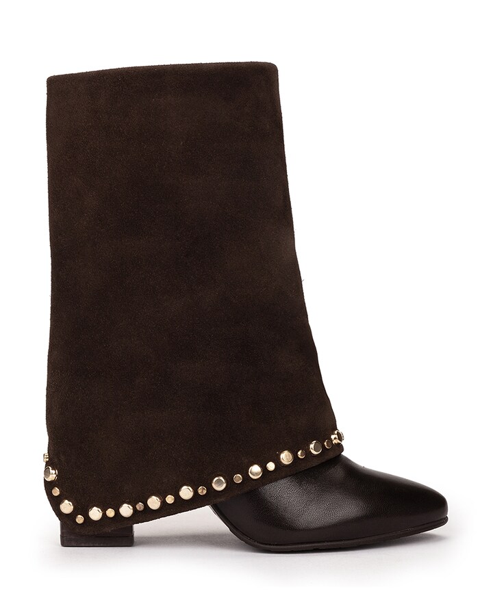 Botas de mulher com tacão e tachas. Um design especial e moderno graças à sua silhueta e à combinação das tachas com o camurça.
