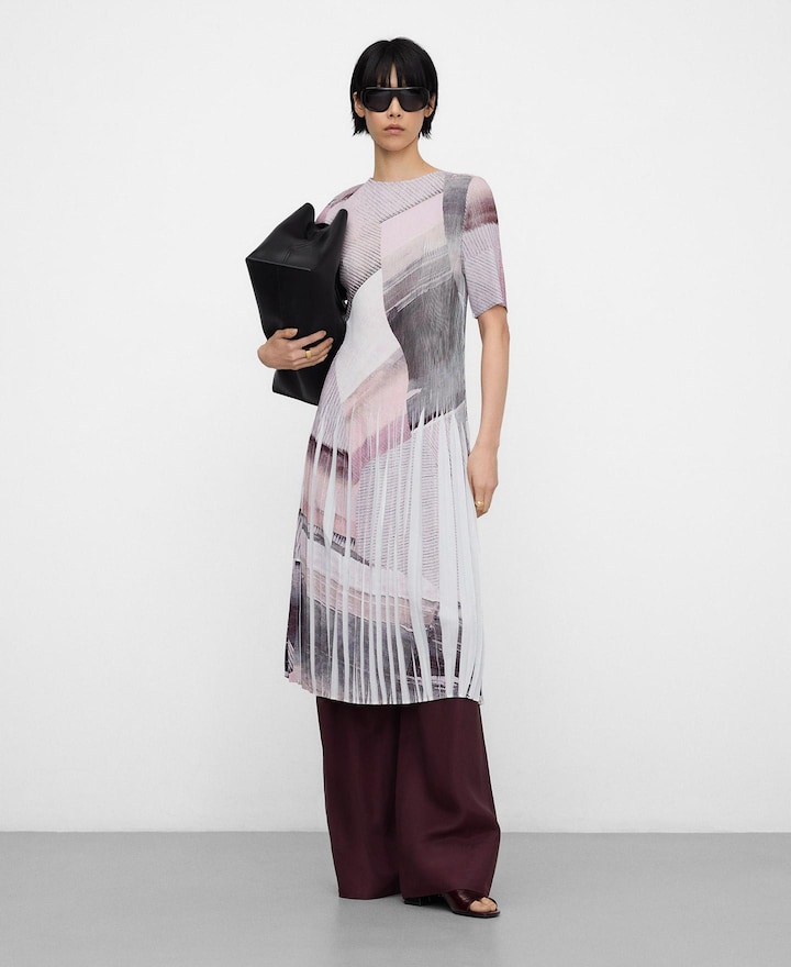 Vestido estampado em tecido crinkle com gola redonda. Tem manga curta sobre o cotovelo e o comprimento é midi.