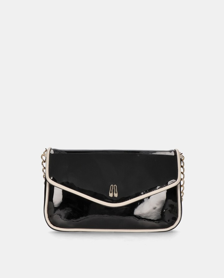 Elegante mala confecionada em verniz. Concebida com uma refinada alça de corrente dourada para levar confortavelmente ao ombro. Ideal para saídas noturnas, este modelo compacto e prático mede 11 cm de altura, 19 cm de comprimento e 4 cm de largura.