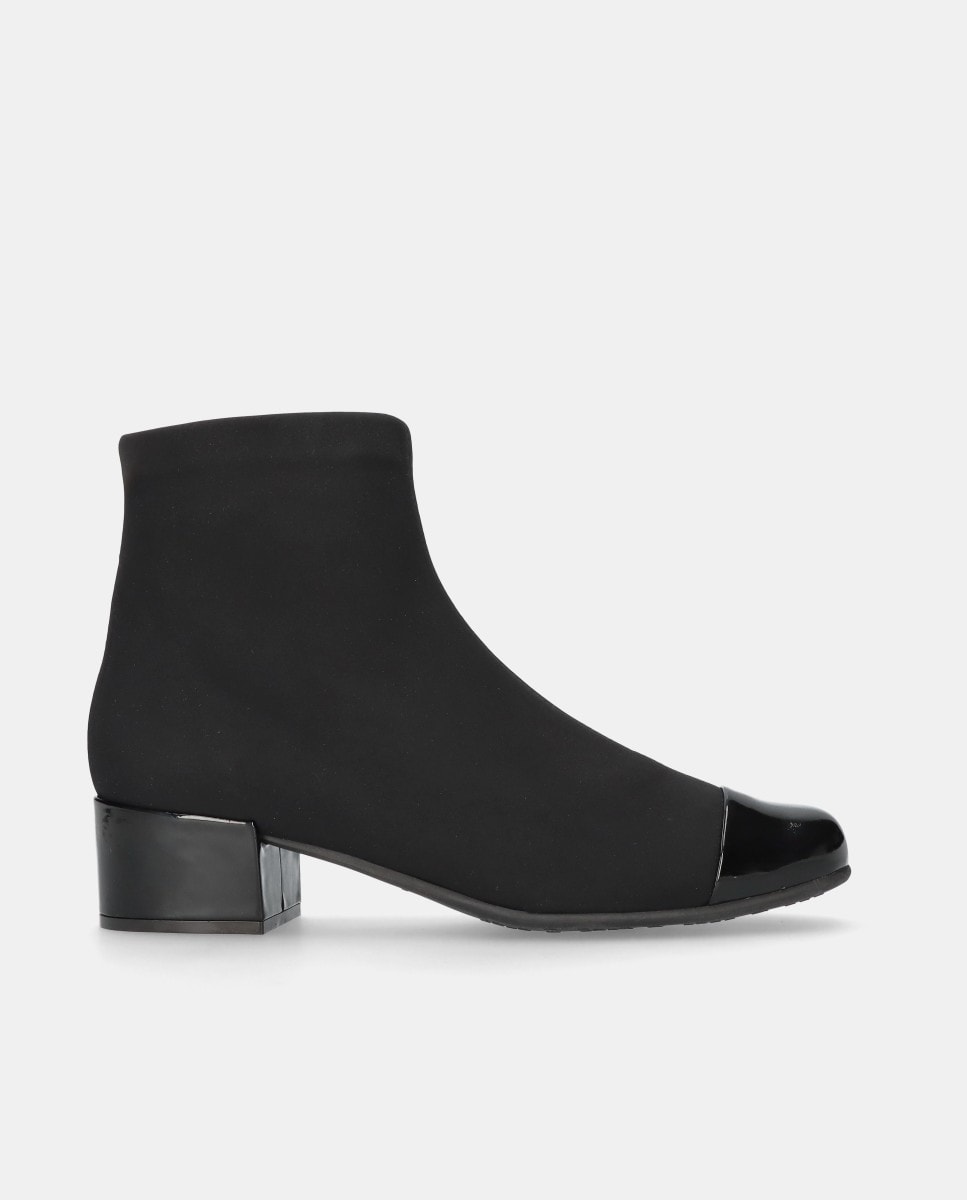 Botins modelo Milan em tecido elástico resistente à água com biqueira de verniz, tacão de 4.5cm, sola de borracha, palmilha de pele e forro de tecido.