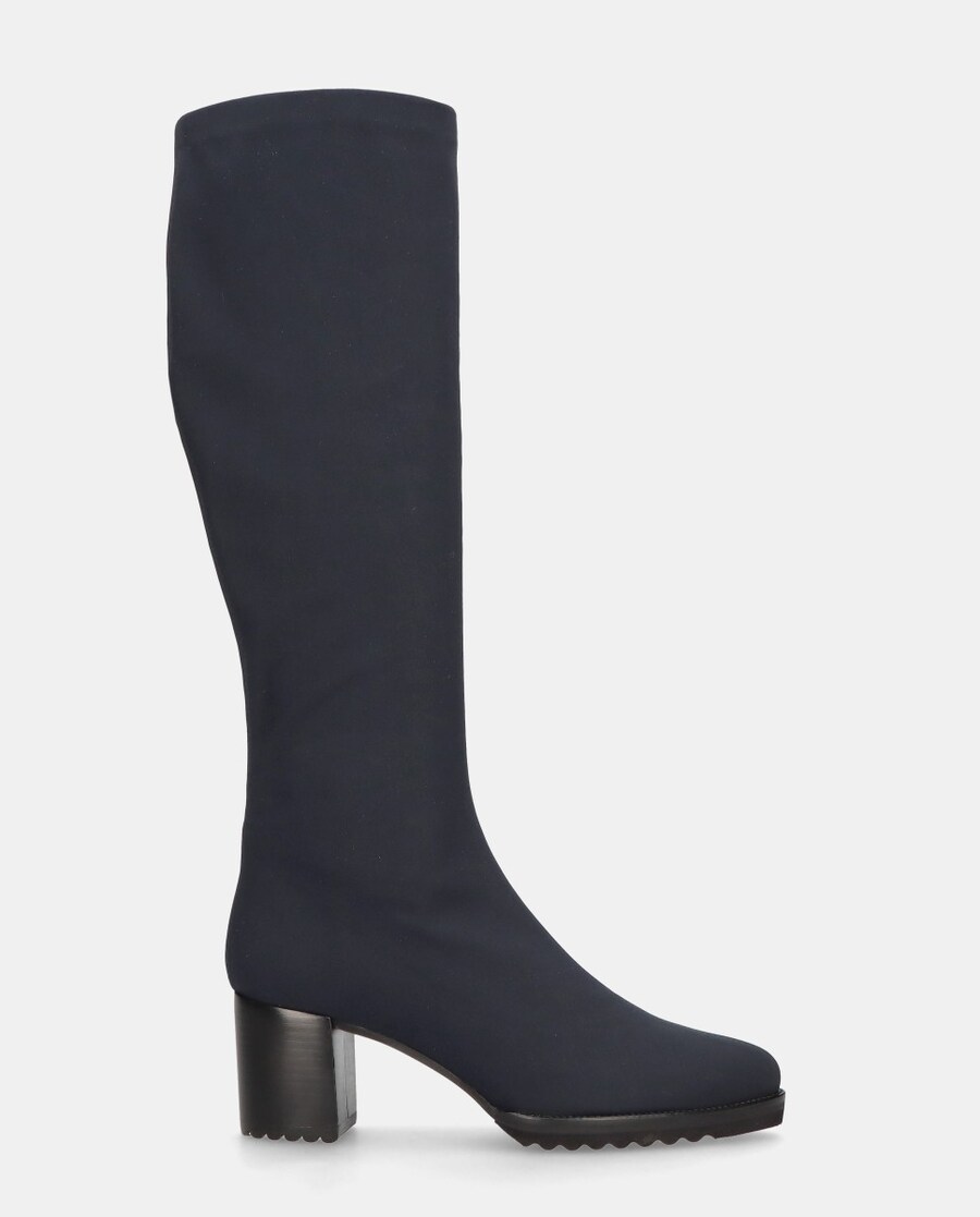 Bota modelo Cindy em tecido elástico resistente à água com tacão de 6cm, sola de borracha, palmilha e forro de tecido.