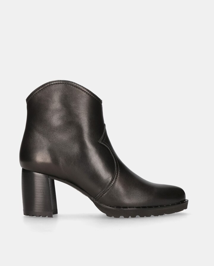 Botins modelo Palermo em napa preta com fecho de correr, tacão de 7 cm, sola de borracha, palmilha e forro de pele.