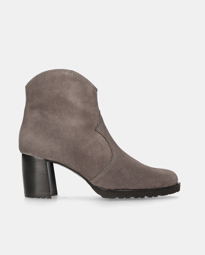 Botins modelo Palermo em camurça cinza com fecho de correr, tacão de 7cm, sola de borracha, palmilha e forro de pele.