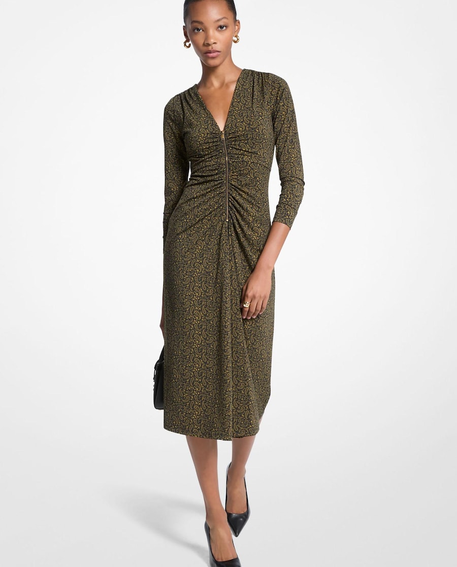 Este vestido com padrão paisley tem tanto de sedutor como de feminino. Confecionado em malha mate com um toque de elasticidade, o modelo de manga comprida apresenta fecho central no corpete franzido e bainha média adorada por todos. Destaca o padrão com acessórios minimalistas. Feito Com Pelo Menos 50% De Matéria Orgânica