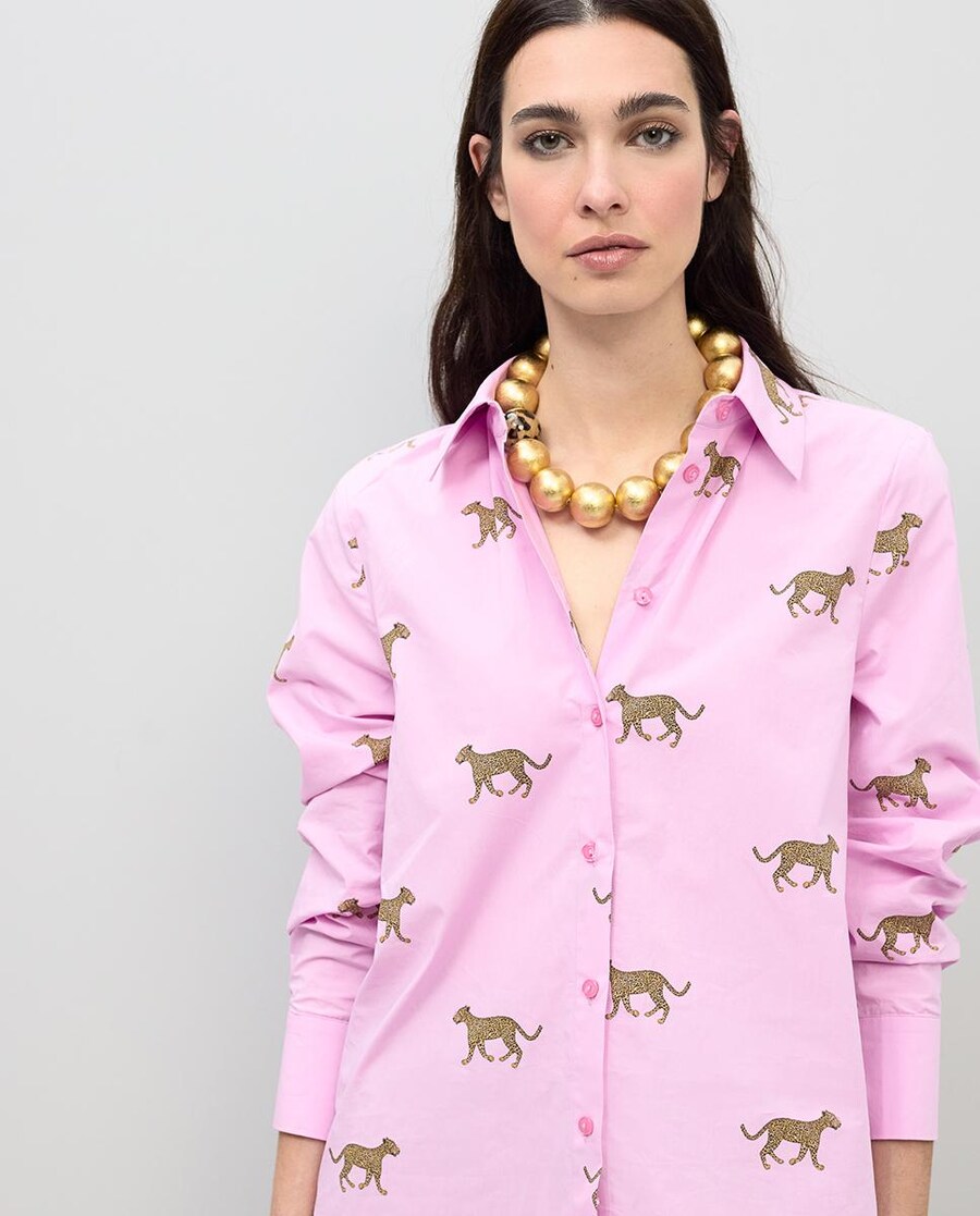 Camisa de popelina suave com estampado discreto de leopardo. Gola clássica e fecho frontal de botões. Mangas compridas com punhos com botões. Ideal para um toque selvagem no teu guarda-roupa diário.