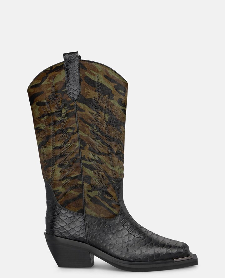 Meia bota para mulher estampada. Com biqueira arredondada e tacão de largo, sem fecho. A altura do tacão é de 6cm e o cano mede 19cm.