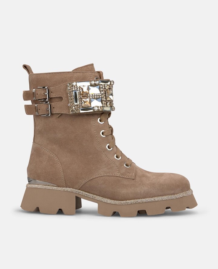 Botins para mulher com lingueta coberta de pedraria e fivelas. Com biqueira arredondada, fecho de correr e sola track. A altura do tacão é de 4,6cm e o cano mede 15cm.