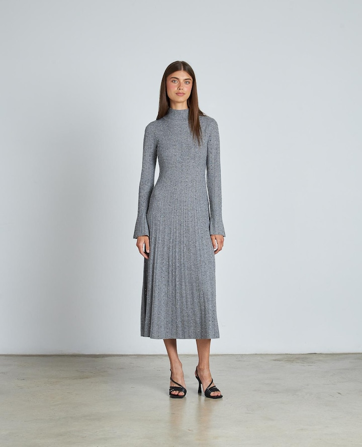 Vestido Midi Ajustado com Pedraria e Saia Comprida com Volume