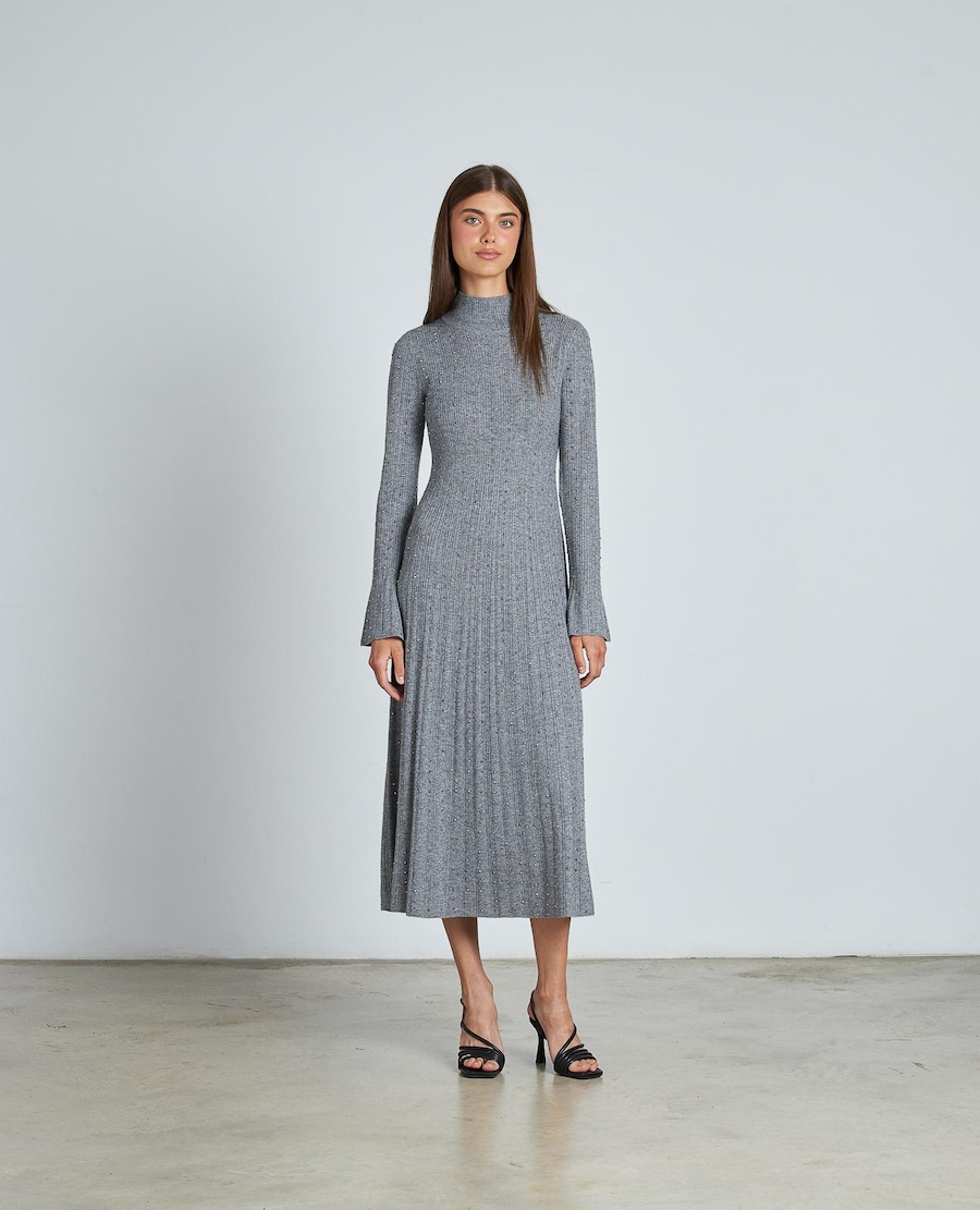 Vestido de mulher ajustado com pedraria, saia comprida com volume e manga comprida. Com gola alta. Confecionado em viscose e nylon. As medidas da modelo a vestir o tamanho S são: altura 1,68cm, peito 87cm, cintura 63cm e anca 88cm.
