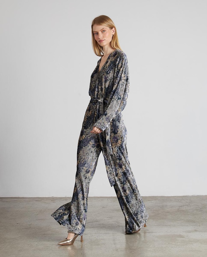 Macacão de mulher fluído estampado, com cinto. Com decote em V e manga comprida. Confecionado em poliéster. As medidas da modelo a vestir o tamanho S são: altura 1,68cm, peito 87cm, cintura 63cm e anca 88cm.