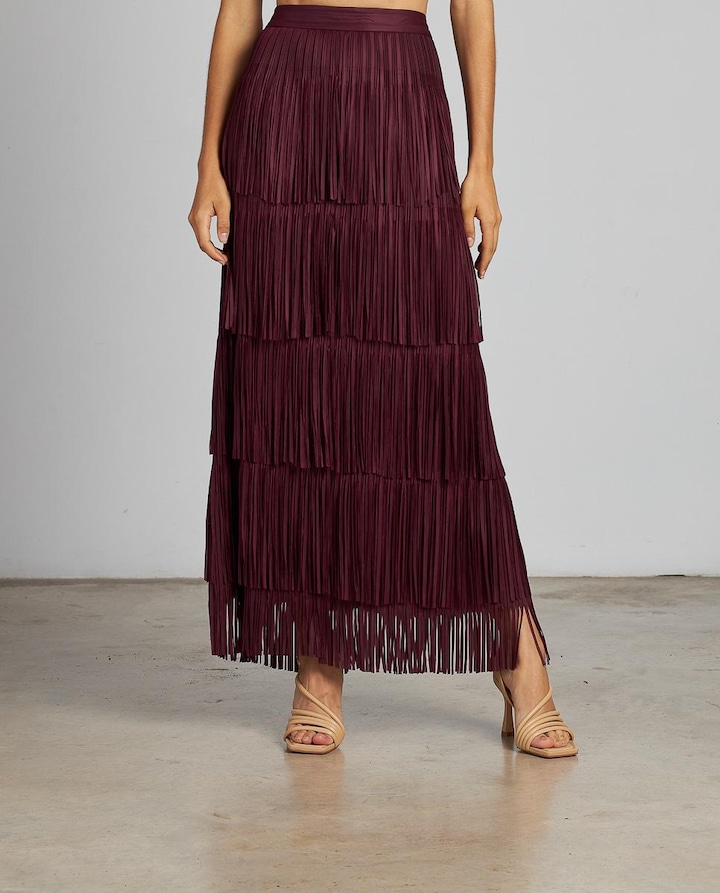 Saia com franjas midi de mulher. Fecho de correr. As medidas da modelo a vestir o tamanho S são: altura 1,68cm, peito 87cm, cintura 63cm e anca 88cm.