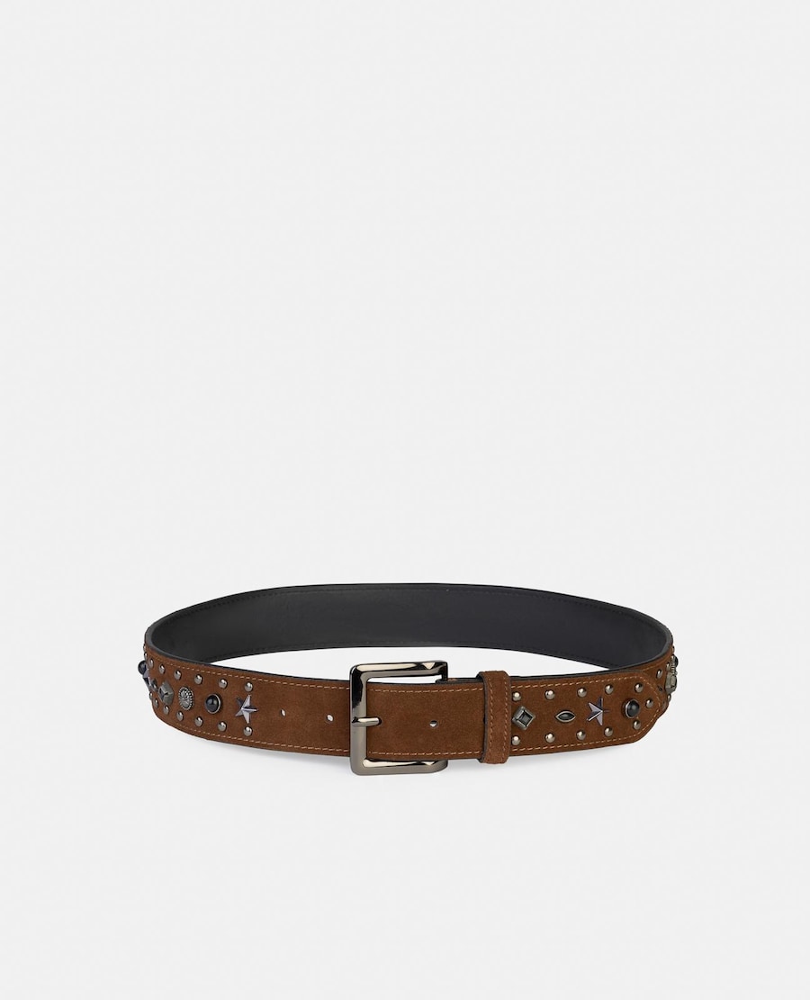 Cinto de 4 cm de largura realizado em pele com detalhes de tachas. Fivela metálica quadrada.
