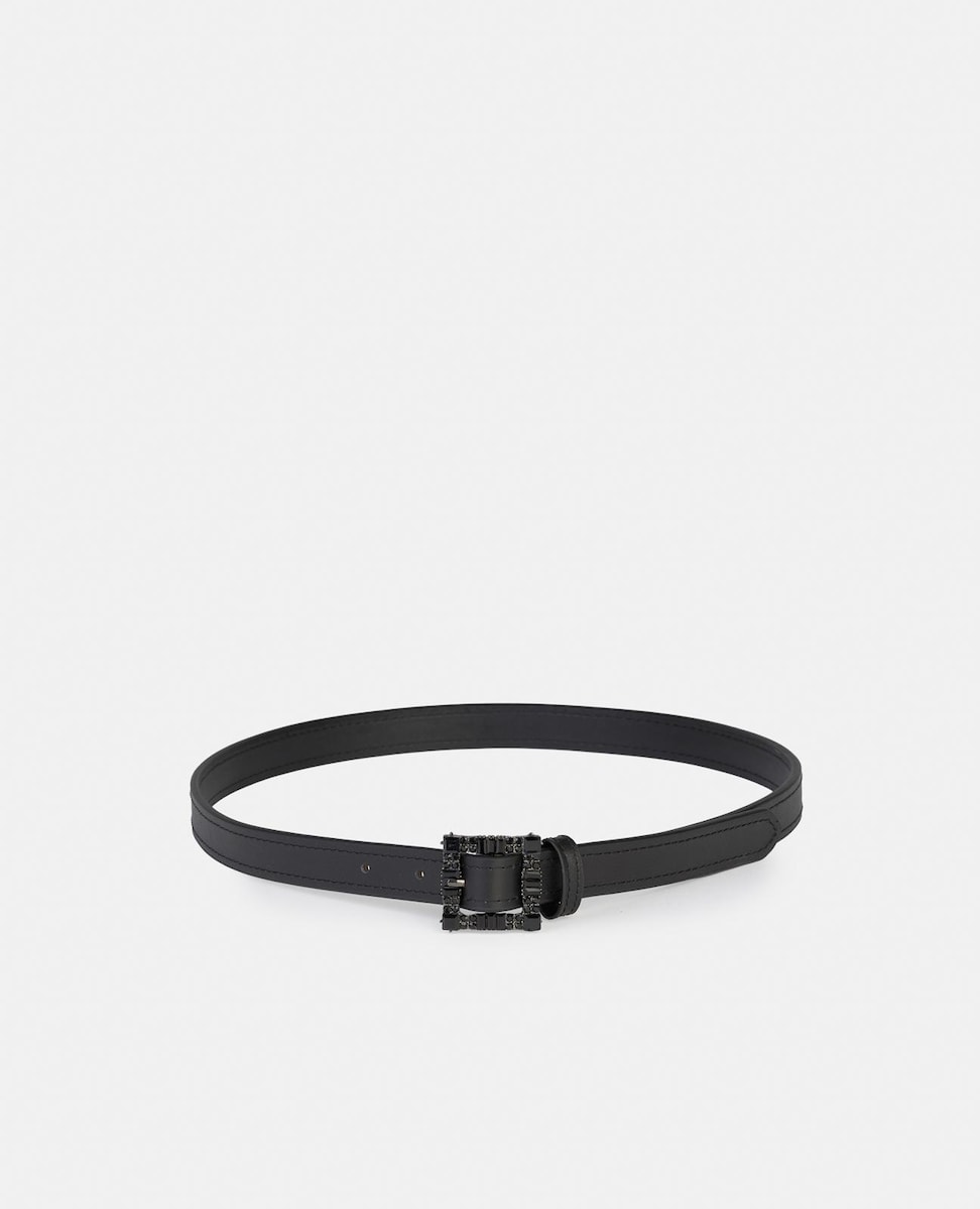 Cinto de 4 cm de largura realizado em pele com detalhes de pedraria na fivela. Fivela metálica quadrada.