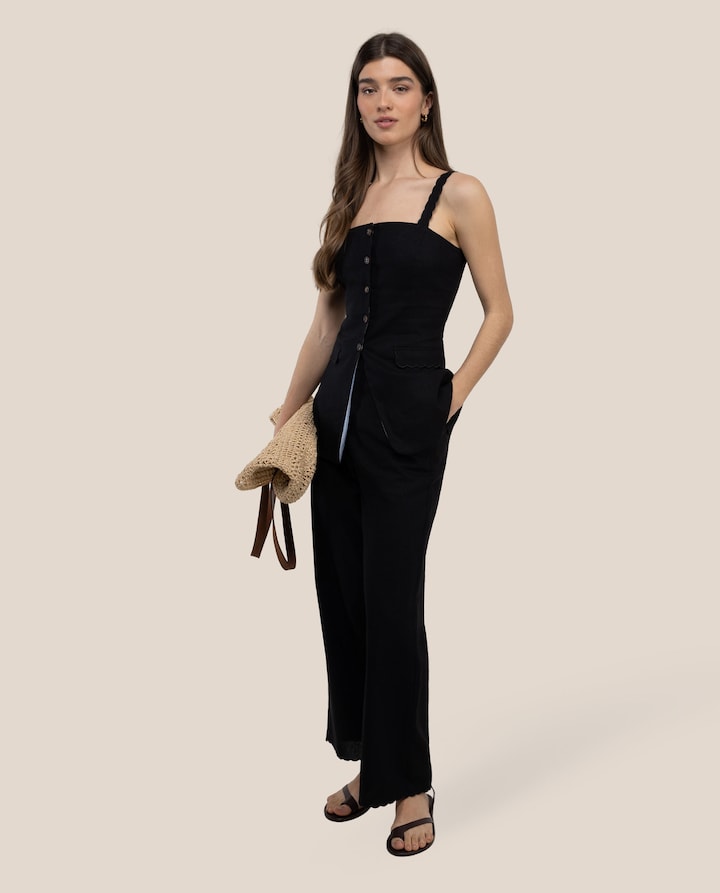 Calças de mulher de corte a direito e cintura alta. A bainha das calças tem detalhes de bordados. Inclui bolsos frontais na costura lateral. Fecho com botão e fecho de correr oculto.