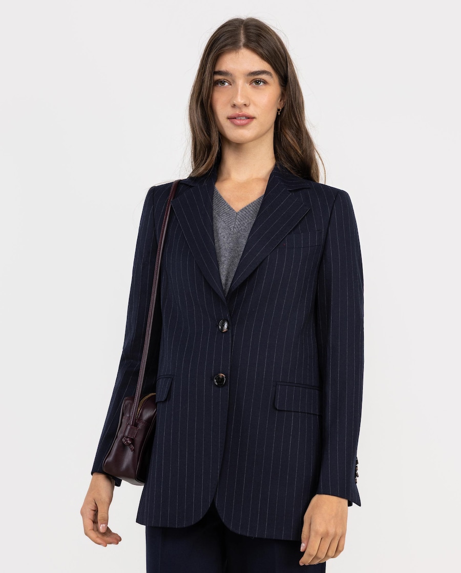 Blazer confecionado em tecido de mescla de lã estampado às riscas diplomáticas. Corte regular fit. Fecho mediante botões. Bolsos com aba na parte frontal. Forro em contraste.