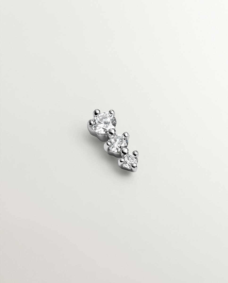 Este piercing da coleção Les Delicieux é sinónimo de brilho e elegância. Os seus três diamantes transparentes fundem-se com o ouro branco dando lugar a uma joia incrivelmente brilhante. O ponto de luz que o seu earlook precisa. Todas as nossas gemas e pérolas são naturais. Cada uma delas é totalmente única, por isso a sua tonalidade pode variar em relação à imagem de referência.