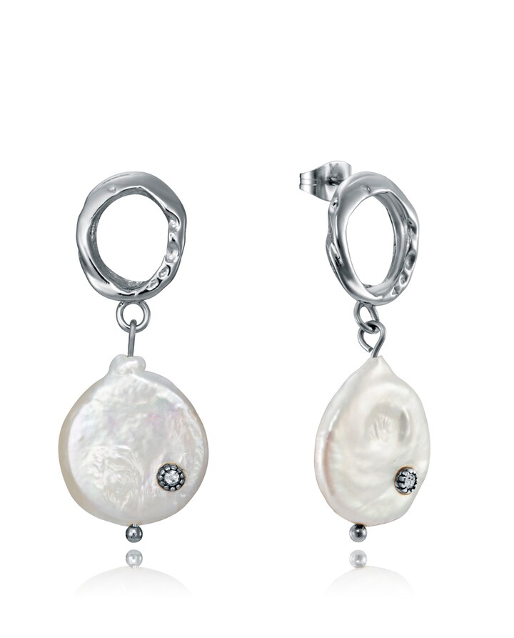 Brincos Viceroy Chic de aço em forma de aro irregular e pérola natural plana pendurada com zircônia incrustada. Comprimento de 37 mm.