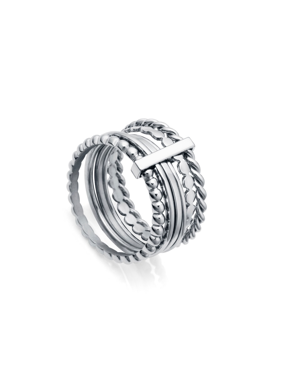 Anel Viceroy Kiss de aço multitiras. Disponível Tamanho 10 (diâmetro interior 15,92 mm), Tamanho 12 (diâmetro interior 16,55 mm), Tamanho 14 (diâmetro interior 17,19 mm), Tamanho 16 (diâmetro interior 17,83 mm).