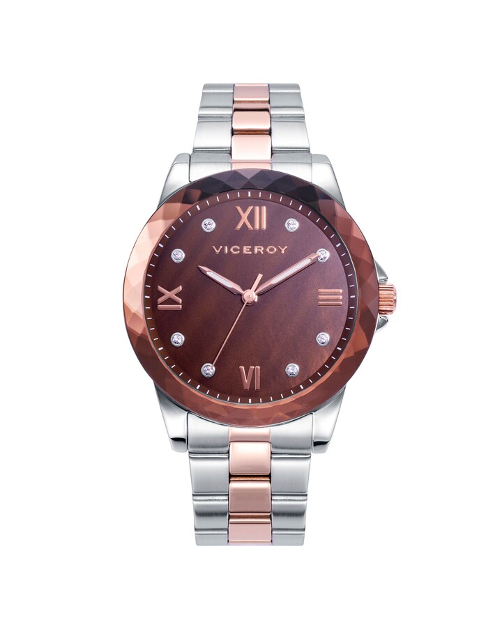 Relógio de mulher Viceroy Chic três agulhas, caixa e bracelete em aço bicolor com bisel facetado, mostrador madre pérola.