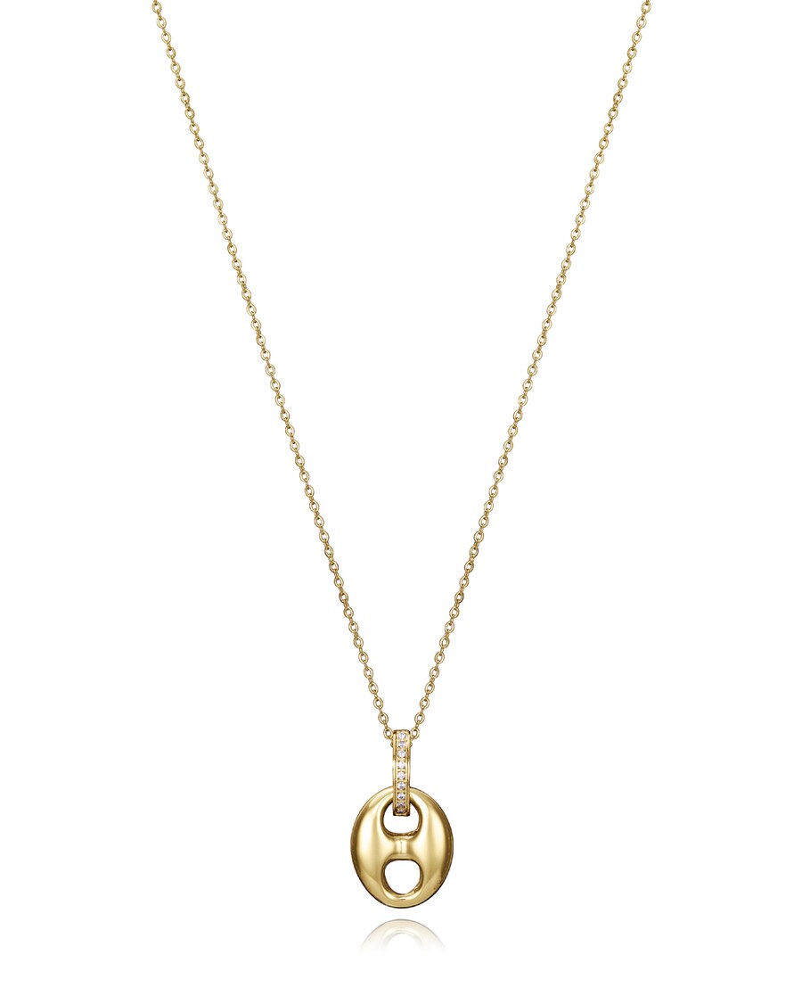 Elegante colar de aço dourado e zircónias brancas com pendente em forma de elo e 42 cm de comprimento. Um fino design destinado a transcender, isso é o que dá este complemento poderoso na sua simplicidade. Um colar que te irá trazer luz, poder e muita personalidade. Usá-lo é uma responsabilidade. Comprimento: 42 cm.