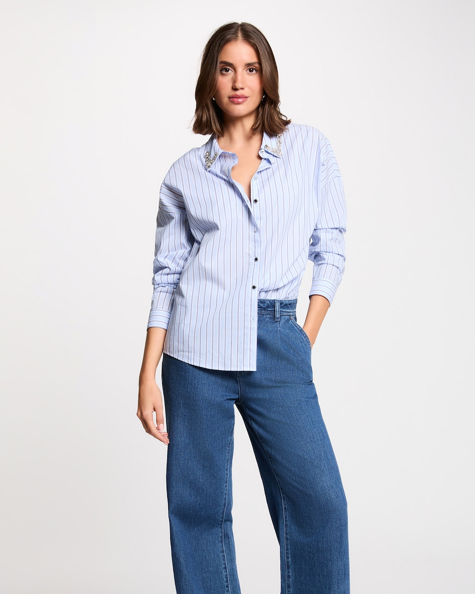 Esta camisa às riscas oversize reinventa o casual chic com um estilo gráfico e moderno. A gola com lapela realça a postura do pescoço, enquanto os detalhes de strass iluminam sutilmente o conjunto para um toque feminino e refinado. Seu corte amplo brinca com os volumes, afirmando um estilo decididamente na moda. - Camisa - Corte oversize - Gola com lapela - Mangas compridas - Riscas - Detalhes de strass Ideias de look - A camisa às riscas oversize com detalhes de strass combina com uns jeans largos de cintura alta e botins em biqueira para um estilo descontraído mas sofisticado. - Esta camisa luminosa usa-se aberta sobre um top ajustado, combinada com uma saia lápis texturizada e uma mala estruturada para brincar com os contrastes modernos. Conselho de manutenção Lave a sua camisa a 30°C em um ciclo ultra delicado para preservar as fibras do tecido. O passar a ferro é possível: utilize uma temperatura baixa (máximo 110°) e não aplique vapor sob nenhuma circunstância, pois está totalmente desaconselhado. Não coloque esta peça na máquina de secar, isto também está totalmente desaconselhado.