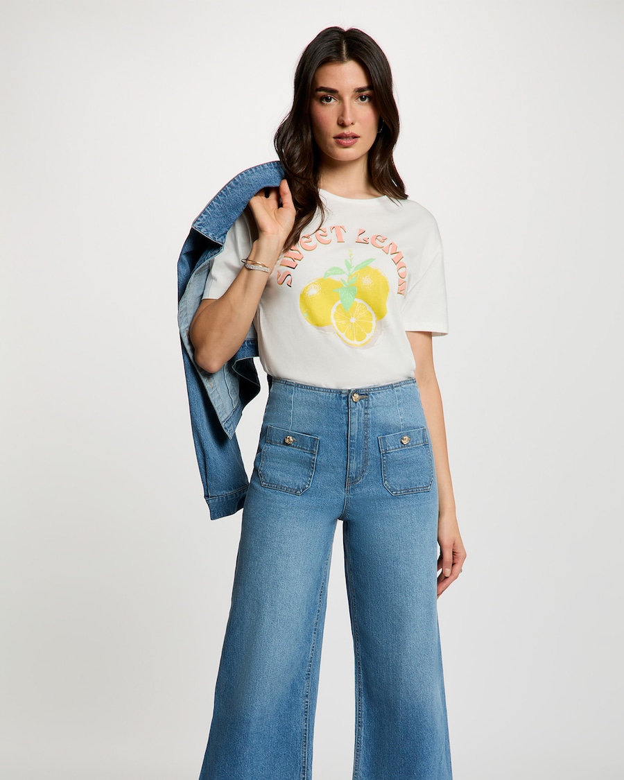 Esta T-shirt de corte a direito adapta-se harmoniosamente a todas as morfologias. O seu estampado aporta um toque moderno e de tendência, ideal para realçar os seus conjuntos com subtileza. O estilo casual chic equilibra conforto e elegância, convertendo esta peça num imprescindível do armário feminino contemporâneo.- Corte a direito - Gola redonda - Mangas curtas - Estampado.