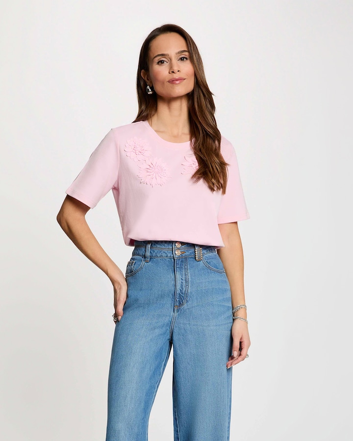 Esta T-shirt de corte a direito favorece todas as silhuetas com um estilo elegante e moderno. Os bordados delicados aportam um toque feminino e sofisticado, perfeitos para realçar o seu estilo casual chic.- Corte a direito - Gola redonda - Mangas curtas - Bordado.