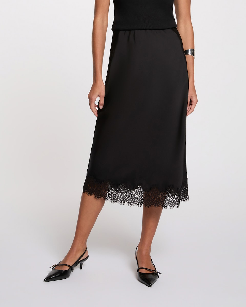 Esta saia comprida e ajustada encarna uma feminidade sofisticada graças à sua cintura alta que alonga delicadamente a silhueta. A fluidez do seu tecido, realçada por um aspeto acetinado luminoso, aporta uma elegância moderna irresistível. O detalhe da abertura revela subtilmente as pernas com sensualidade, enquanto que os toques de renda adicionam um acabamento refinado e chic. - Saia comprida - Ajustada - Fluida - Cintura alta - Acetinada - Abertura - Renda