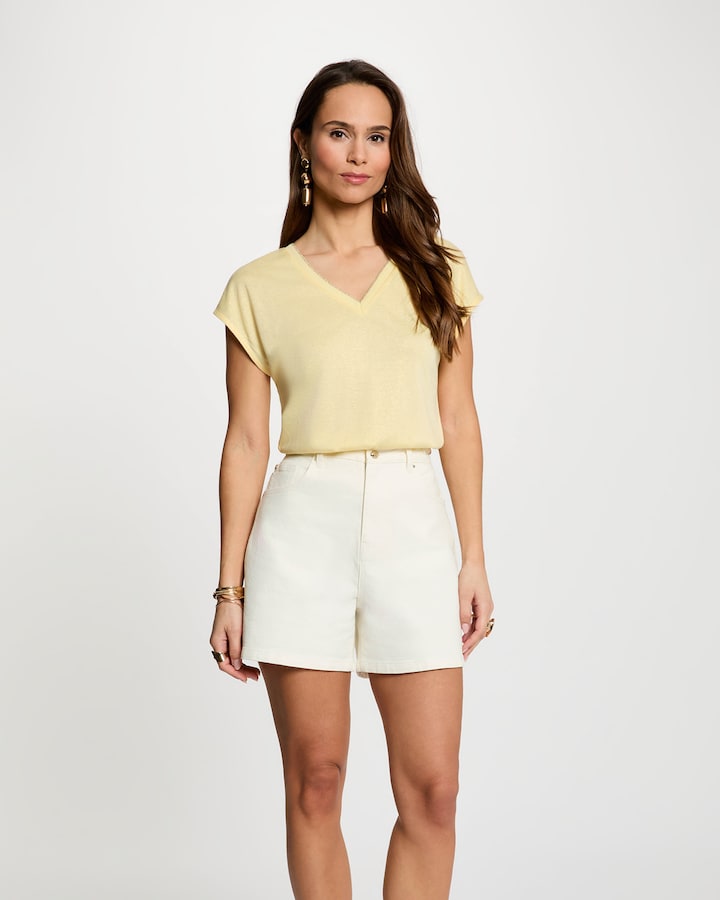T-shirt de manga curta Corte a direito Decote em V Manga curta Bordas metalizadas na gola Detalhes com fios metalizados