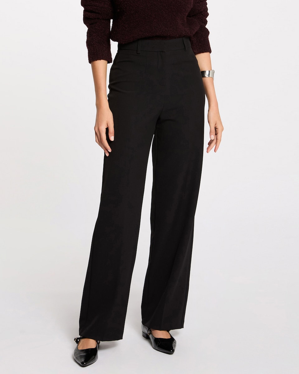 Calças com corte a direito e pinças Cintura alta Corte a direito2 bolsos com aba na parte posterior Fecho de correr na parte frontal Pinças nas pernas Presilhas na cintura.