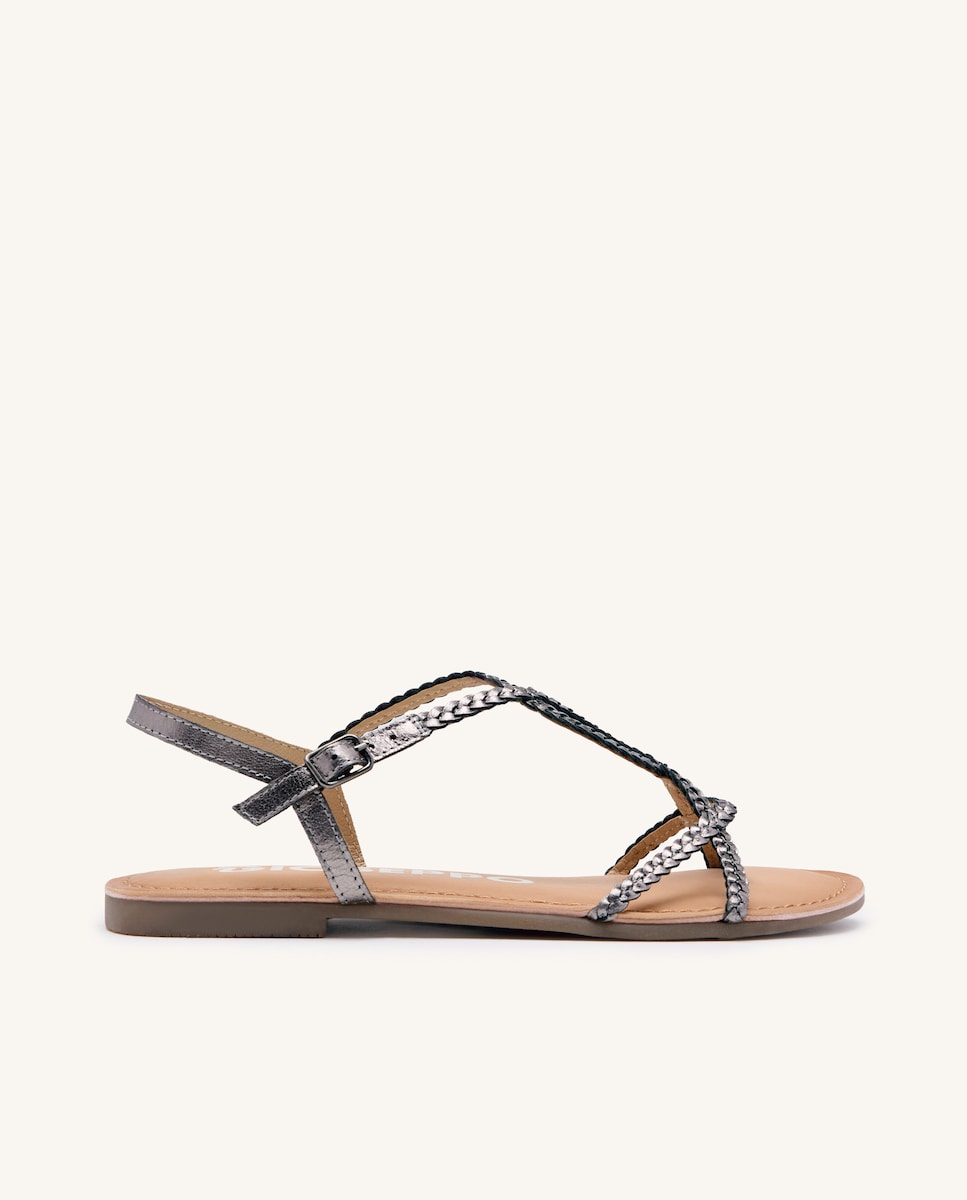 Sandálias de tiras finas trançadas em pele. Fecho no torno com fivela. Palmilha de pele com acolchoado de látex de suave toque para garantir um maior conforto. Palmilha de pele curtida em curtumes que seguem um protocolo de curtimento mais sustentável sob os padrões Leather Working Group. Sola flexível. Um básico que não passa de moda de temporada para temporada.