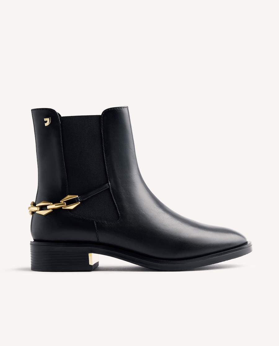 Botins de pele tipo chelsea com corrente dourada no calcanhar e peça metalizada no interior do tacão. Biqueira ovalada. Contam com palmilha acolchoada e elásticos nas laterais do cano. Altura do tacão: 4 cm. Seguimos a guia padrão de larguras do cano, ajustando a medida conforme o tamanho. Corte e forro de pele e poliéster respirável. Palmilha de pele. Sola de TPR flexível. As possíveis variações na pele ou no acabamento entre ambos os pés refletem a autenticidade do processo artesanal e do uso de peles naturais.