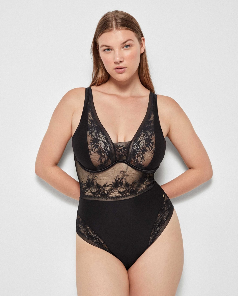 Body com aro e copas de foam ultraleve em tecido de renda extraplano muito delicado e feminino que não marca. Acabamentos acetinados para um maior conforto e posterior efeito tanga. Fecho posterior e alças reguláveis. Disponível em copas B e C.